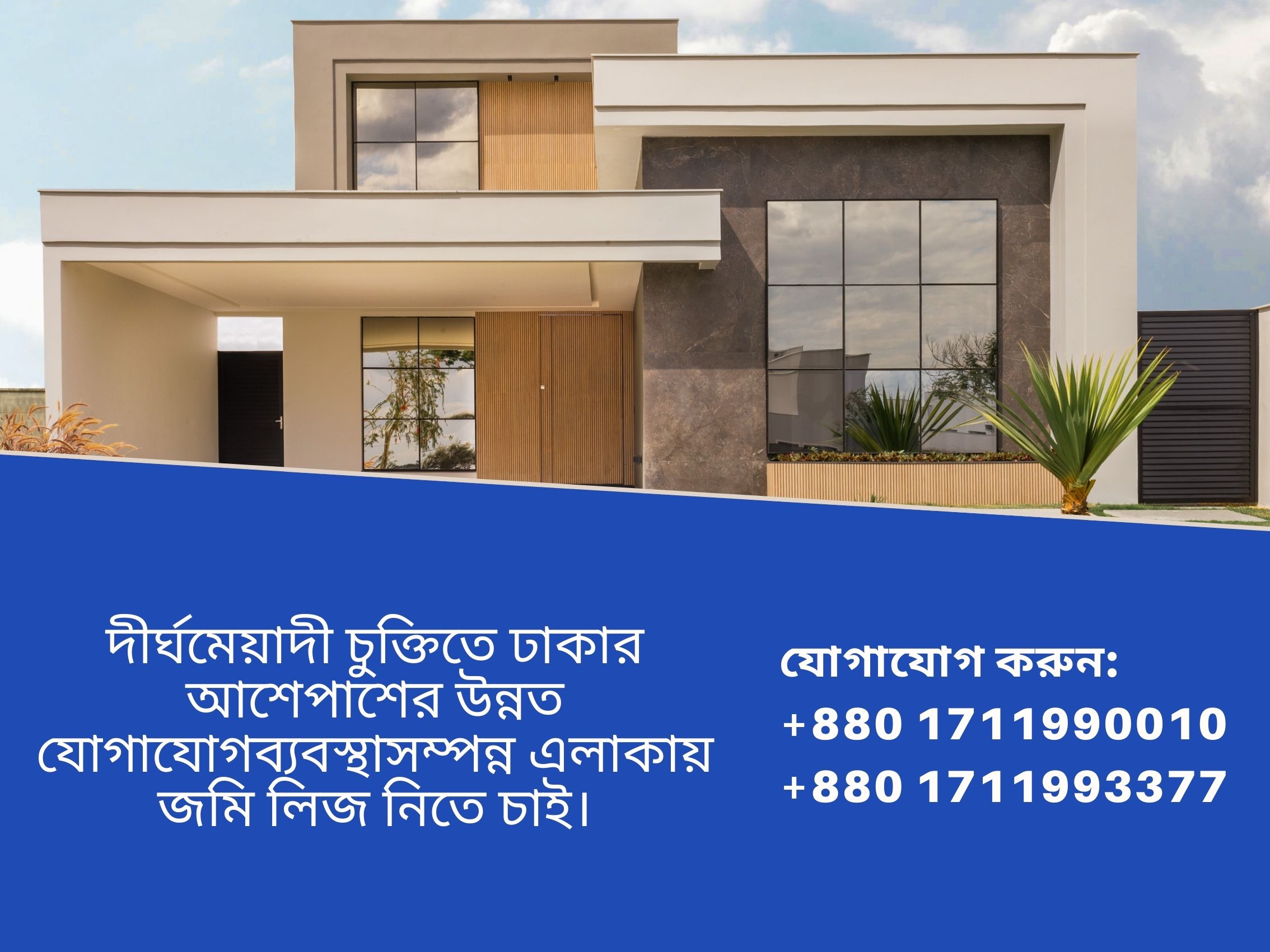 দীর্ঘমেয়াদী চুক্তিতে ঢাকার আশেপাশের উন্নত যোগাযোগব্যবস্থাসম্পন্ন এলাকায় জমি লিজ নিতে চাই—কারণ সঠিক লোকেশন ও দীর্ঘমেয়াদী লিজ চুক্তি জমির মালিকদের জন্য একটি টেকসই আর্থিক সমাধান এবং নিরাপদ বিনিয়োগের সুযোগ তৈরি করে। আমরা এমন জমি খুঁজছি যা বাণিজ্যিক, শিল্প বা লজিস্টিক প্রকল্পের জন্য উপযোগী এবং যেখানে সড়ক সংযোগ, পরিবহন সুবিধা ও অবকাঠামো উন্নত মানের। উত্তরা, পূর্বাচল, আশুলিয়া, সাভার, নারায়ণগঞ্জ, গাজীপুর, কেরানীগঞ্জ ও মাওয়ার মতো কৌশলগত এলাকাগুলো আমাদের বিশেষ অগ্রাধিকার। আমাদের স্বচ্ছ, বৈধ ও পেশাদার লিজ প্রক্রিয়া জমির মালিকদের জন্য নিশ্চিত মাসিক বা বাৎসরিক আয়, জমির সুরক্ষা ও রক্ষণাবেক্ষণ, এবং ভবিষ্যতে জমির মূল্য বৃদ্ধি নিশ্চিত করে। এইভাবে আপনার জমি হবে আয় ও নিরাপত্তার এক স্থায়ী উৎস।